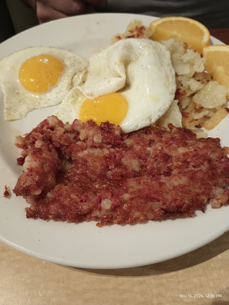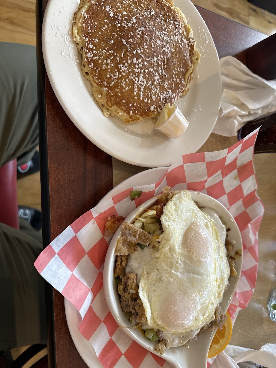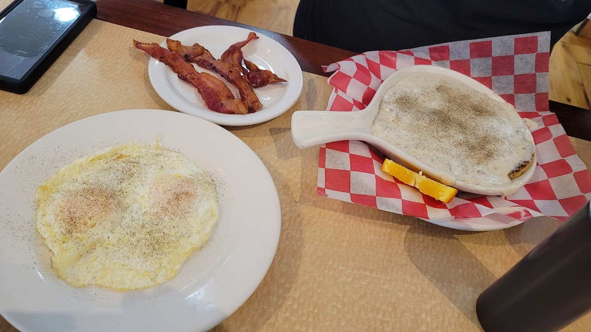 The menu leans hard into breakfast classics, but with enough variety to keep you curious. There’s fluffy omelets, golden pancakes, thick-cut bacon, and that legendary biscuit-and-gravy combo people describe in reviews as stick to your ribs comfort food. On my last visit I tried their corned beef hash, and it wasn’t the canned stuff either. You could taste the house prep, chunky potatoes and real beef crisped on the griddle. I asked the server about it and she explained they start with a slow sauté to render the fat before finishing it hot and fast. That kind of behind-the-scenes method is why locals swear by this place.